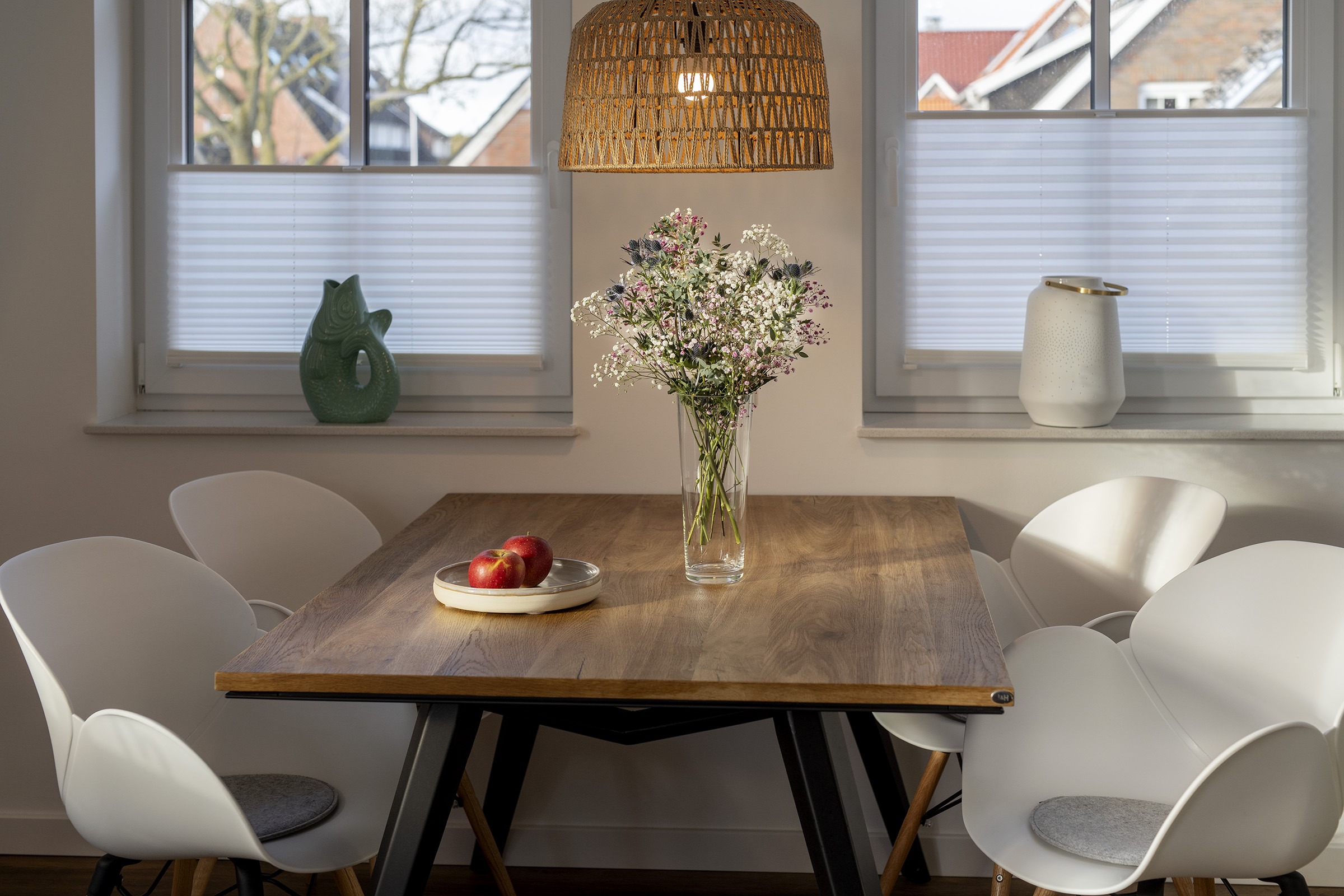 Auf 77 qm lädt die Maisonette Wohnung mit ihren gemütlichen Schrägen, zwei Schlafzimmern sowie zwei Badezimmern zu einem traumhaften Urlaub ein. Der Wohn- Ess & Küchenbereich ist offen gestaltet und von hier kommt man auf den Südwestbalkon. Bei Schietwetter wartet im oberen Bereich der Wohnung eine Sauna. Neben der Sauna befinden sich im oberen Bereich eine Waschmaschine & ein Trockner sowie ein kleiner Arbeitsbereich. Für die kleinen Gäste steht ein Reisebett mit Ausstattung, ein Hochstuhl und eine kleine Spielecke bereit. Die Holztreppe ist mit einem Törchen gesichert.